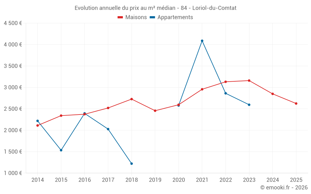 Le prix médian sur les 23 transactions de maisons des 12 derniers mois dans la commune de Loriol-du-Comtat était de 2 632 € par mètre carré pour une valeur foncière médiane de 293 500 €. Sur cette période 60% des transactions se sont situées entre 1 861 et 3 328 € par mètre carré (du 2ème au 8ème déciles).