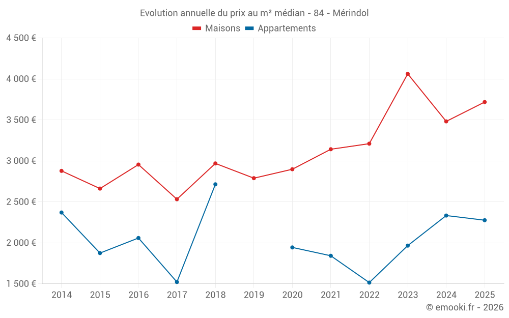 Le prix médian sur les 18 transactions de maisons des 12 derniers mois dans la commune de Mérindol était de 3 718 € par mètre carré pour une valeur foncière médiane de 329 800 €. Sur cette période 60% des transactions se sont situées entre 2 902 et 5 769 € par mètre carré (du 2ème au 8ème déciles).