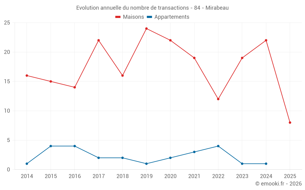 Le prix médian sur les 19 transactions de maisons des 12 derniers mois dans la commune de Mirabeau était de 2 590 € par mètre carré pour une valeur foncière médiane de 228 151 €. Sur cette période 60% des transactions se sont situées entre 1 812 et 3 432 € par mètre carré (du 2ème au 8ème déciles).