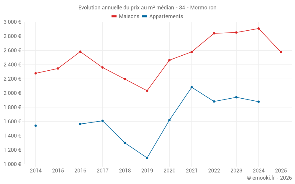 Le prix médian sur les 22 transactions de maisons des 12 derniers mois dans la commune de Mormoiron était de 2 748 € par mètre carré pour une valeur foncière médiane de 312 500 €. Sur cette période 60% des transactions se sont situées entre 2 206 et 3 899 € par mètre carré (du 2ème au 8ème déciles).