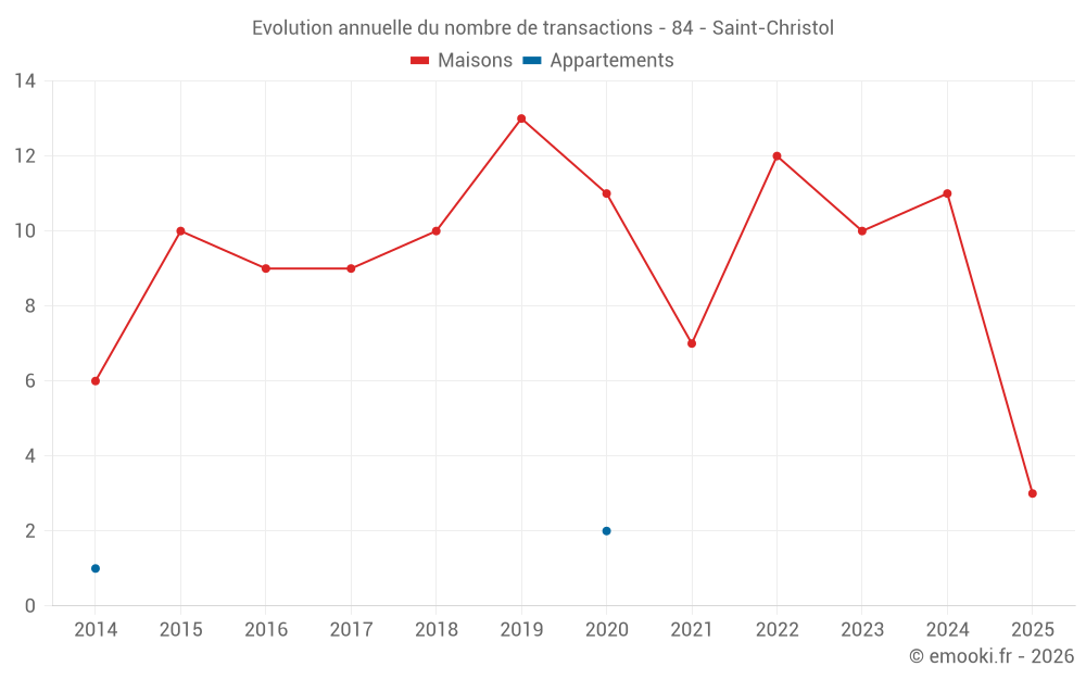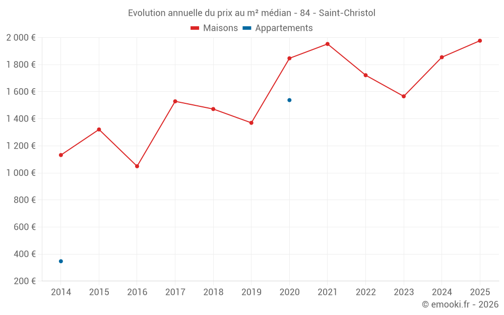 Le prix médian sur les 18 transactions de maisons des 24 derniers mois dans la commune de Saint-Christol était de 1 835 € par mètre carré pour une valeur foncière médiane de 143 000 €. Sur cette période 60% des transactions se sont situées entre 1 295 et 2 559 € par mètre carré (du 2ème au 8ème déciles).