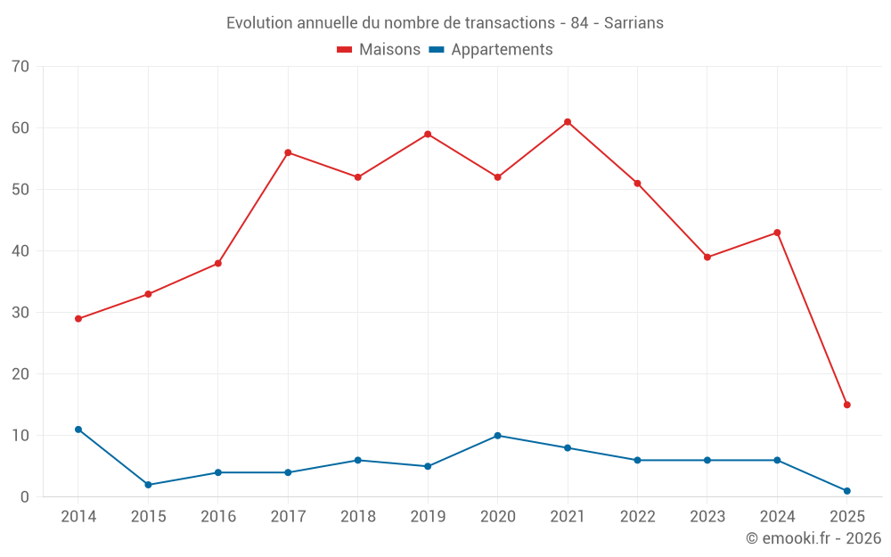 Le prix médian sur les 43 transactions de maisons des 12 derniers mois dans la commune de Sarrians était de 2 538 € par mètre carré pour une valeur foncière médiane de 233 000 €. Sur cette période 60% des transactions se sont situées entre 1 542 et 3 048 € par mètre carré (du 2ème au 8ème déciles).