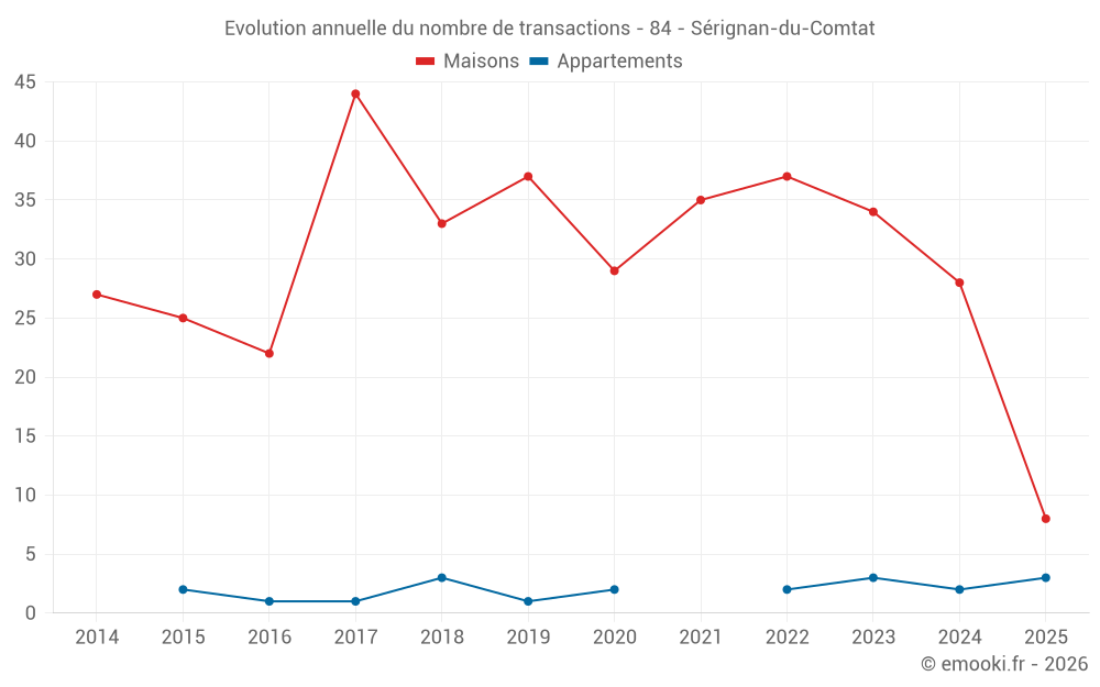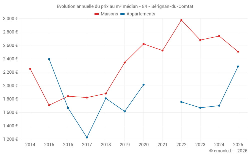 Le prix médian sur les 27 transactions de maisons des 12 derniers mois dans la commune de Sérignan-du-Comtat était de 2 598 € par mètre carré pour une valeur foncière médiane de 230 000 €. Sur cette période 60% des transactions se sont situées entre 1 693 et 3 323 € par mètre carré (du 2ème au 8ème déciles).