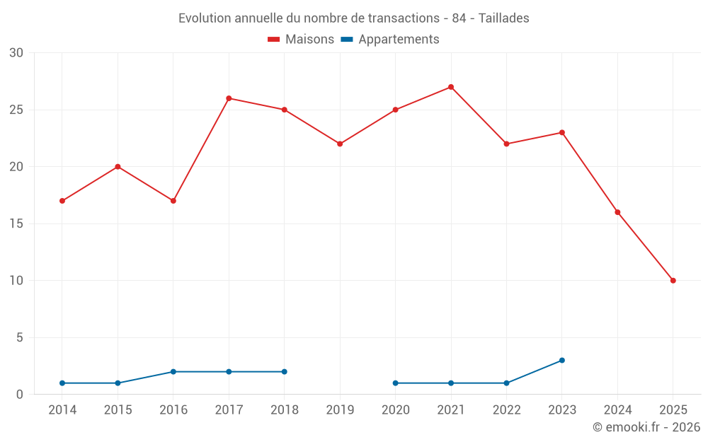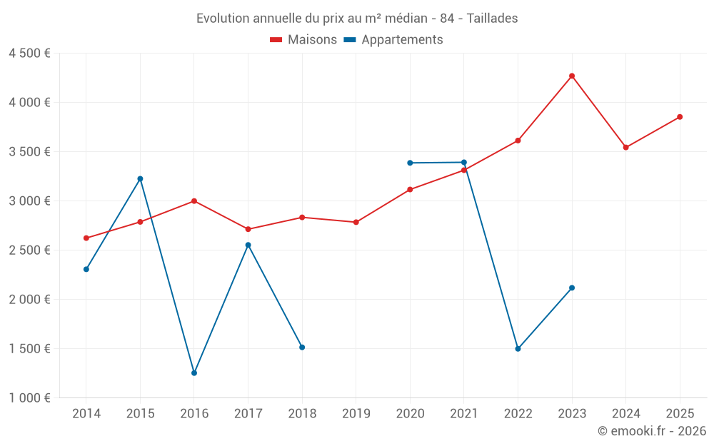 Le prix médian sur les 21 transactions de maisons des 12 derniers mois dans la commune de Taillades était de 3 695 € par mètre carré pour une valeur foncière médiane de 431 700 €. Sur cette période 60% des transactions se sont situées entre 3 025 et 4 853 € par mètre carré (du 2ème au 8ème déciles).