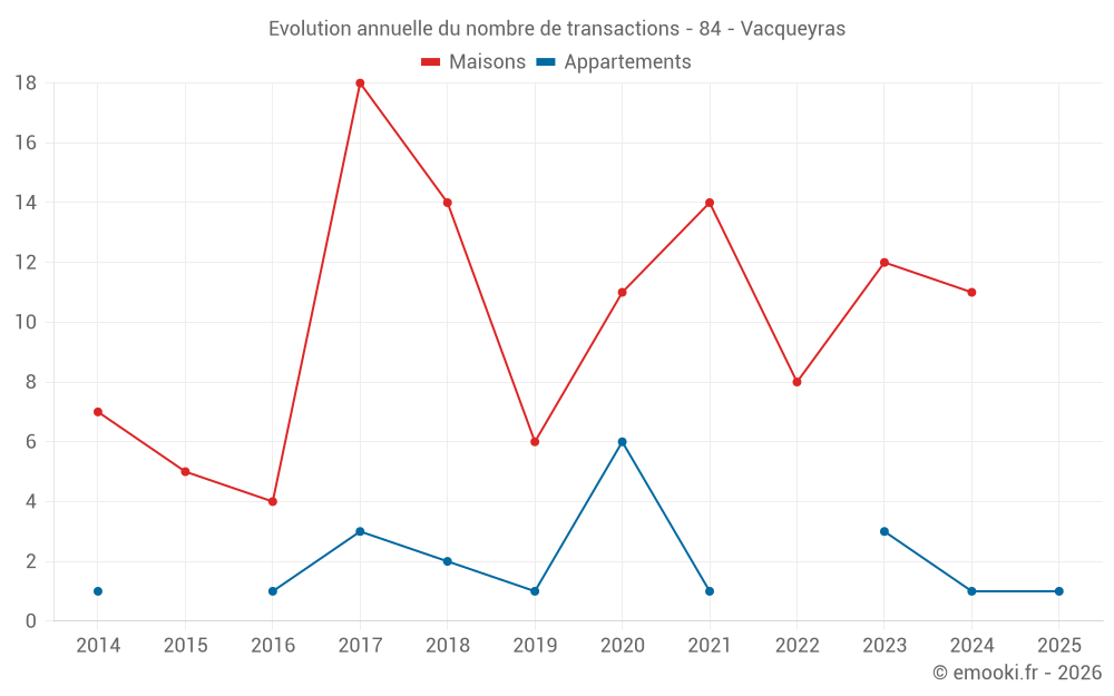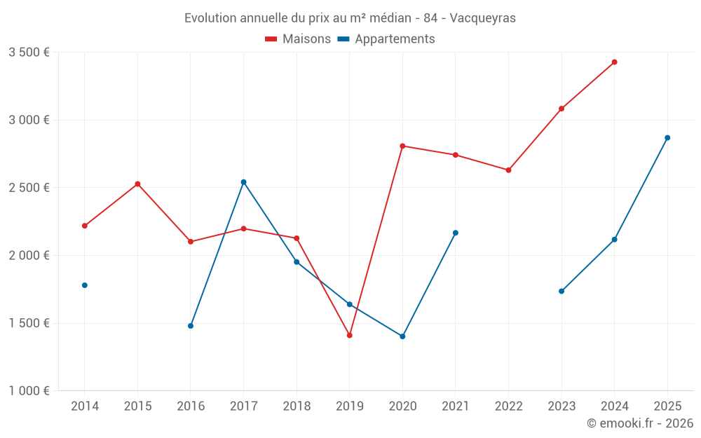 Le prix médian sur les 17 transactions de maisons des 24 derniers mois dans la commune de Vacqueyras était de 3 279 € par mètre carré pour une valeur foncière médiane de 373 650 €. Sur cette période 60% des transactions se sont situées entre 2 702 et 3 874 € par mètre carré (du 2ème au 8ème déciles).