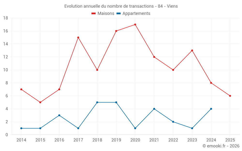 Le prix médian sur les 20 transactions de maisons des 24 derniers mois dans la commune de Viens était de 2 556 € par mètre carré pour une valeur foncière médiane de 247 500 €. Sur cette période 60% des transactions se sont situées entre 1 963 et 3 520 € par mètre carré (du 2ème au 8ème déciles).