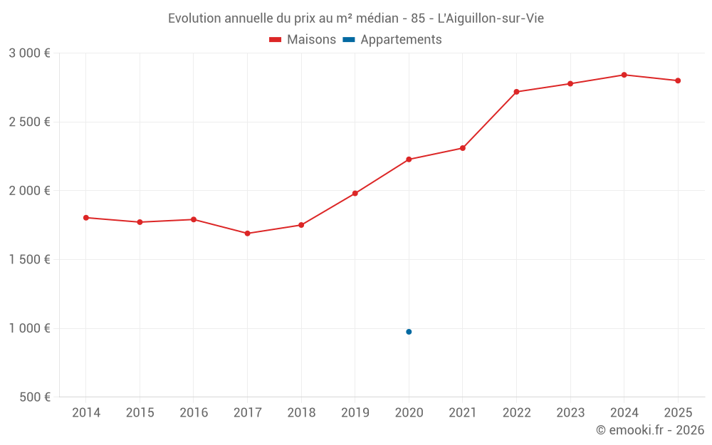 Le prix médian sur les 21 transactions de maisons des 6 derniers mois dans la commune de l'Aiguillon-sur-Vie était de 2 800 € par mètre carré pour une valeur foncière médiane de 202 000 €. Sur cette période 60% des transactions se sont situées entre 2 271 et 3 221 € par mètre carré (du 2ème au 8ème déciles).