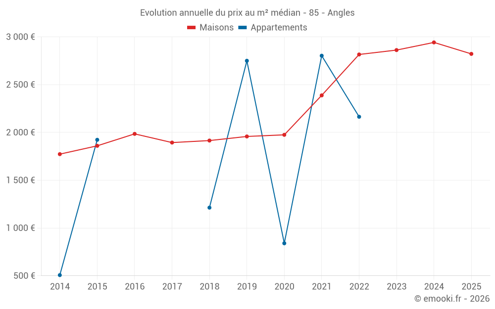 Le prix médian sur les 30 transactions de maisons des 6 derniers mois dans la commune d'Angles était de 2 822 € par mètre carré pour une valeur foncière médiane de 205 000 €. Sur cette période 60% des transactions se sont situées entre 2 507 et 3 213 € par mètre carré (du 2ème au 8ème déciles).