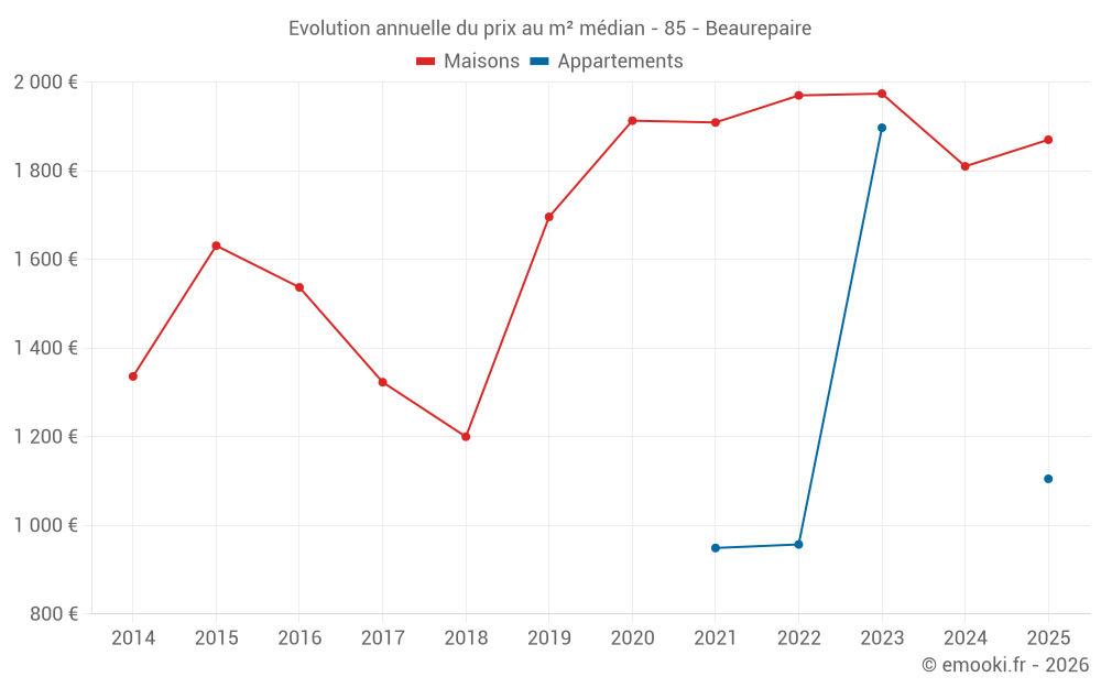 Le prix médian sur les 27 transactions de maisons des 24 derniers mois dans la commune de Beaurepaire était de 1 864 € par mètre carré pour une valeur foncière médiane de 178 500 €. Sur cette période 60% des transactions se sont situées entre 1 552 et 2 383 € par mètre carré (du 2ème au 8ème déciles).