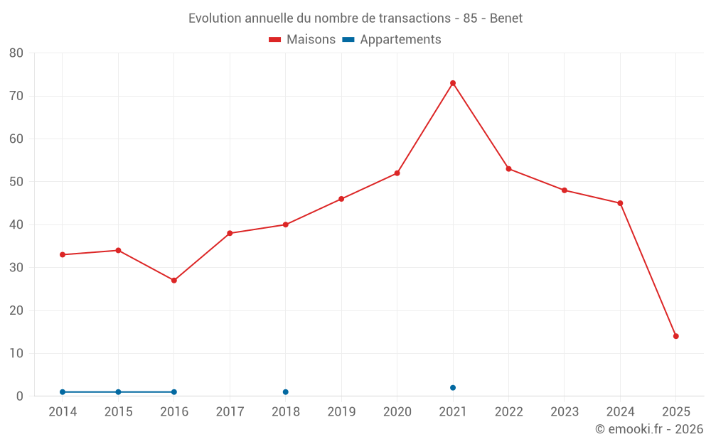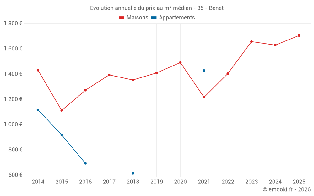 Le prix médian sur les 40 transactions de maisons des 12 derniers mois dans la commune de Benet était de 1 616 € par mètre carré pour une valeur foncière médiane de 182 000 €. Sur cette période 60% des transactions se sont situées entre 1 160 et 2 281 € par mètre carré (du 2ème au 8ème déciles).