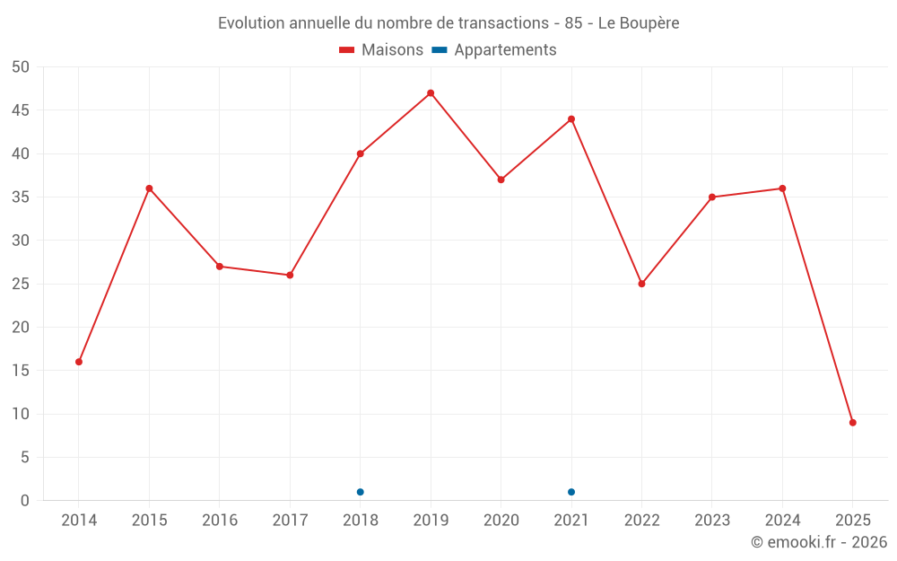 Le prix médian sur les 27 transactions de maisons des 12 derniers mois dans la commune du Boupère était de 1 282 € par mètre carré pour une valeur foncière médiane de 139 000 €. Sur cette période 60% des transactions se sont situées entre 881 et 2 040 € par mètre carré (du 2ème au 8ème déciles).