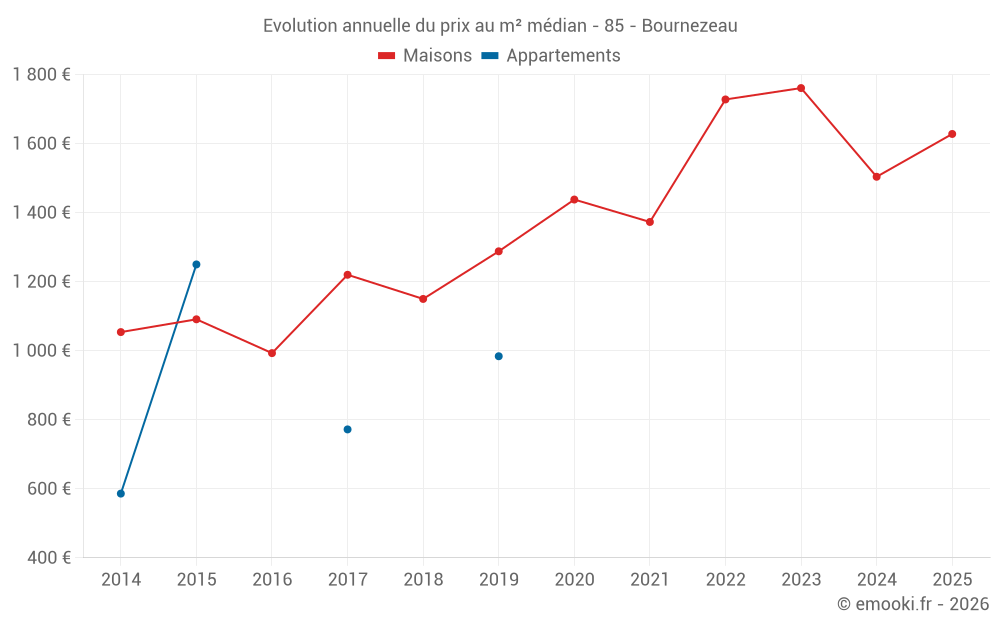 Le prix médian sur les 36 transactions de maisons des 12 derniers mois dans la commune de Bournezeau était de 1 674 € par mètre carré pour une valeur foncière médiane de 124 500 €. Sur cette période 60% des transactions se sont situées entre 1 056 et 2 250 € par mètre carré (du 2ème au 8ème déciles).