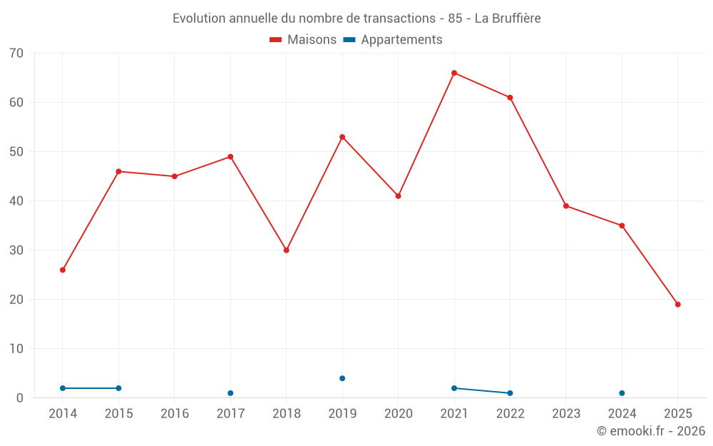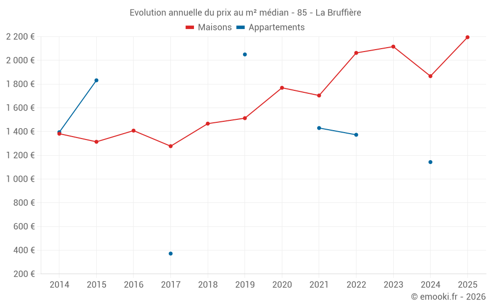 Le prix médian sur les 19 transactions de maisons des 6 derniers mois dans la commune de la Bruffière était de 2 195 € par mètre carré pour une valeur foncière médiane de 181 000 €. Sur cette période 60% des transactions se sont situées entre 1 678 et 2 247 € par mètre carré (du 2ème au 8ème déciles).