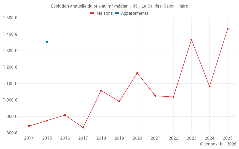 Le prix médian sur les 20 transactions de maisons des 24 derniers mois dans la commune de la Caillère-Saint-Hilaire était de 1 193 € par mètre carré pour une valeur foncière médiane de 119 250 €. Sur cette période 60% des transactions se sont situées entre 621 et 1 824 € par mètre carré (du 2ème au 8ème déciles).