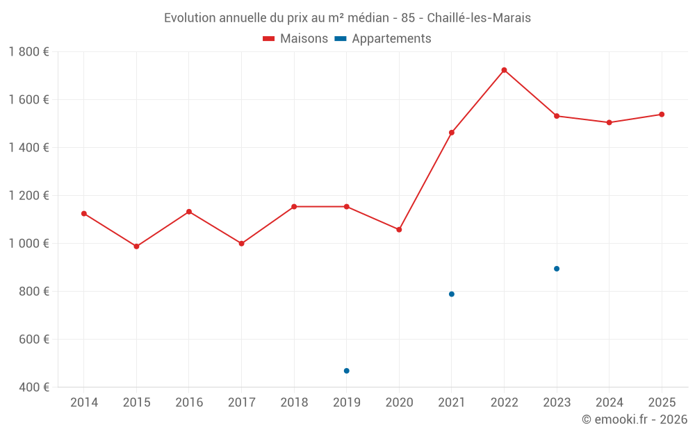 Le prix médian sur les 31 transactions de maisons des 12 derniers mois dans la commune de Chaillé-les-Marais était de 1 610 € par mètre carré pour une valeur foncière médiane de 167 451 €. Sur cette période 60% des transactions se sont situées entre 1 143 et 2 203 € par mètre carré (du 2ème au 8ème déciles).