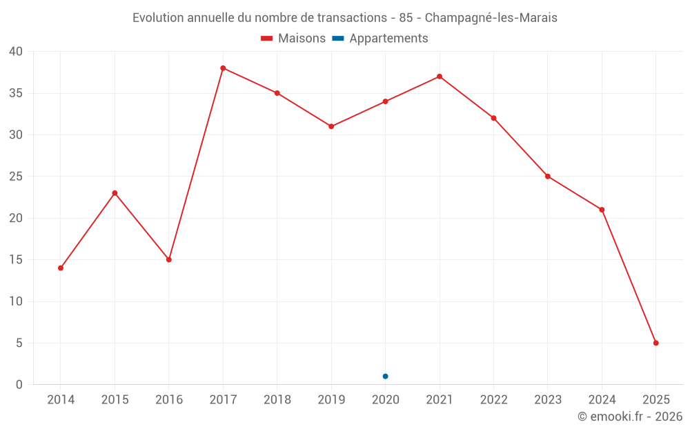 Le prix médian sur les 19 transactions de maisons des 12 derniers mois dans la commune de Champagné-les-Marais était de 2 008 € par mètre carré pour une valeur foncière médiane de 182 000 €. Sur cette période 60% des transactions se sont situées entre 1 268 et 2 628 € par mètre carré (du 2ème au 8ème déciles).