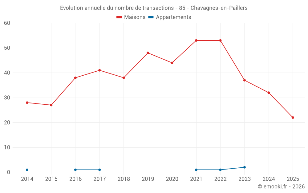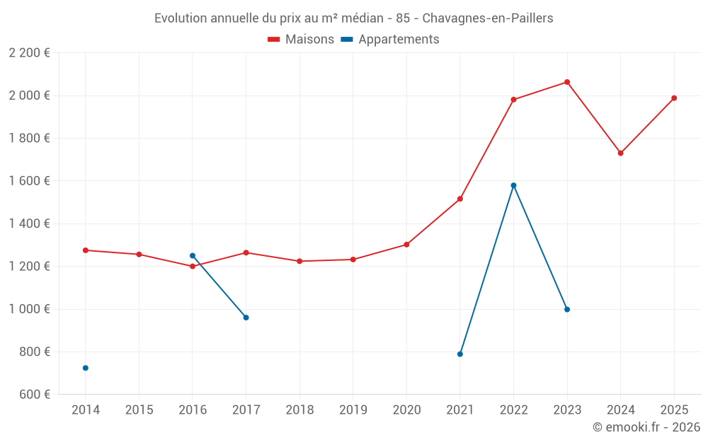 Le prix médian sur les 22 transactions de maisons des 6 derniers mois dans la commune de Chavagnes-en-Paillers était de 1 988 € par mètre carré pour une valeur foncière médiane de 168 500 €. Sur cette période 60% des transactions se sont situées entre 1 473 et 2 416 € par mètre carré (du 2ème au 8ème déciles).
