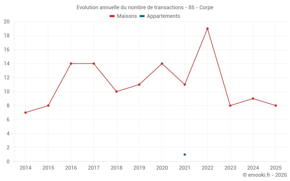 Le prix médian sur les 20 transactions de maisons des 24 derniers mois dans la commune de Corpe était de 2 046 € par mètre carré pour une valeur foncière médiane de 195 050 €. Sur cette période 60% des transactions se sont situées entre 1 530 et 2 534 € par mètre carré (du 2ème au 8ème déciles).