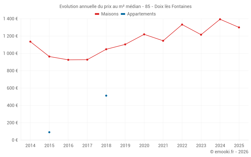 Le prix médian sur les 27 transactions de maisons des 24 derniers mois dans la commune de Doix lès Fontaines était de 1 222 € par mètre carré pour une valeur foncière médiane de 140 000 €. Sur cette période 60% des transactions se sont situées entre 701 et 1 659 € par mètre carré (du 2ème au 8ème déciles).