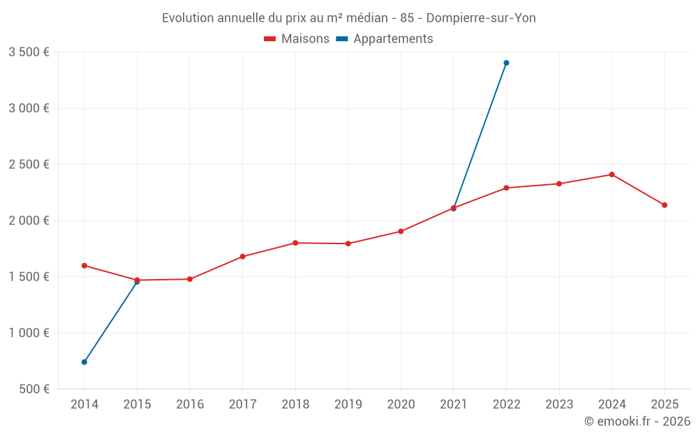 Le prix médian sur les 18 transactions de maisons des 6 derniers mois dans la commune de Dompierre-sur-Yon était de 2 138 € par mètre carré pour une valeur foncière médiane de 224 000 €. Sur cette période 60% des transactions se sont situées entre 1 814 et 2 441 € par mètre carré (du 2ème au 8ème déciles).