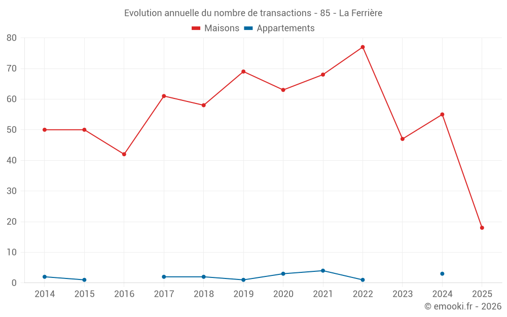 Le prix médian sur les 18 transactions de maisons des 6 derniers mois dans la commune de la Ferrière était de 2 314 € par mètre carré pour une valeur foncière médiane de 217 500 €. Sur cette période 60% des transactions se sont situées entre 2 099 et 2 500 € par mètre carré (du 2ème au 8ème déciles).