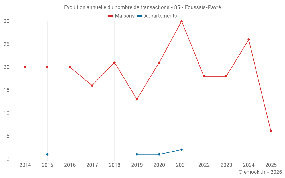 Le prix médian sur les 20 transactions de maisons des 12 derniers mois dans la commune de Foussais-Payré était de 1 124 € par mètre carré pour une valeur foncière médiane de 108 750 €. Sur cette période 60% des transactions se sont situées entre 973 et 1 477 € par mètre carré (du 2ème au 8ème déciles).