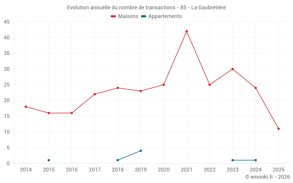 Le prix médian sur les 22 transactions de maisons des 12 derniers mois dans la commune de la Gaubretière était de 2 000 € par mètre carré pour une valeur foncière médiane de 210 000 €. Sur cette période 60% des transactions se sont situées entre 1 689 et 2 366 € par mètre carré (du 2ème au 8ème déciles).