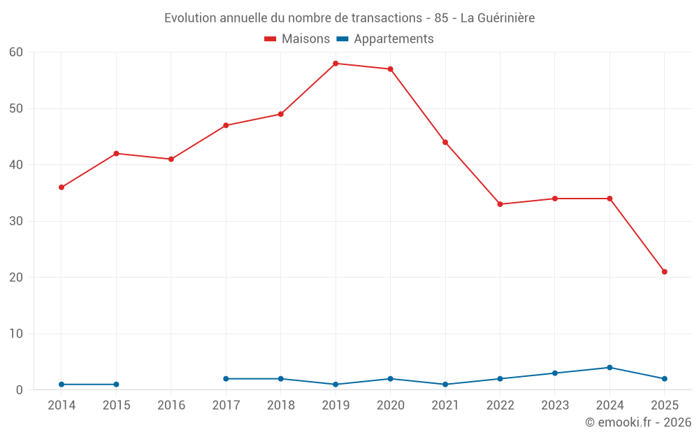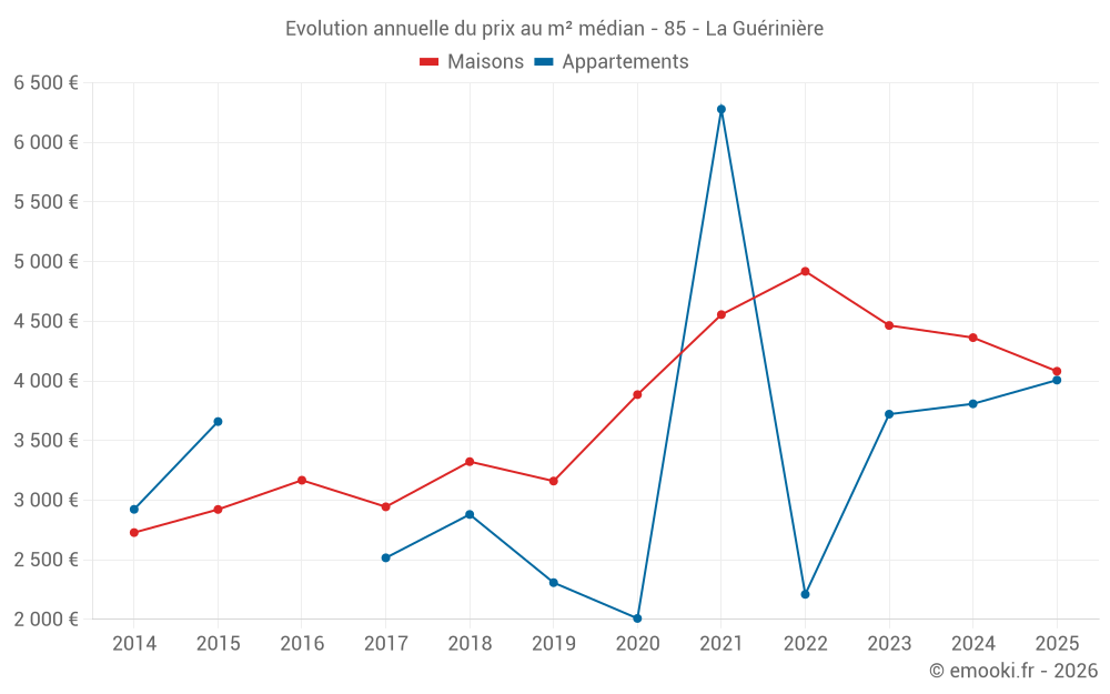 Le prix médian sur les 21 transactions de maisons des 6 derniers mois dans la commune de la Guérinière était de 4 081 € par mètre carré pour une valeur foncière médiane de 305 360 €. Sur cette période 60% des transactions se sont situées entre 2 595 et 5 094 € par mètre carré (du 2ème au 8ème déciles).
