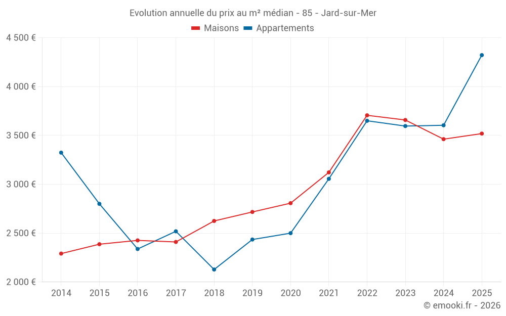 Le prix médian sur les 46 transactions de maisons des 6 derniers mois dans la commune de Jard-sur-Mer était de 3 519 € par mètre carré pour une valeur foncière médiane de 254 252 €. Sur cette période 60% des transactions se sont situées entre 2 566 et 4 243 € par mètre carré (du 2ème au 8ème déciles).