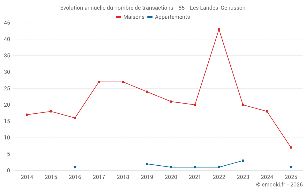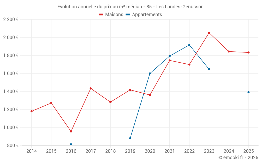Le prix médian sur les 21 transactions de maisons des 12 derniers mois dans la commune des Landes-Genusson était de 1 880 € par mètre carré pour une valeur foncière médiane de 196 000 €. Sur cette période 60% des transactions se sont situées entre 1 369 et 2 358 € par mètre carré (du 2ème au 8ème déciles).