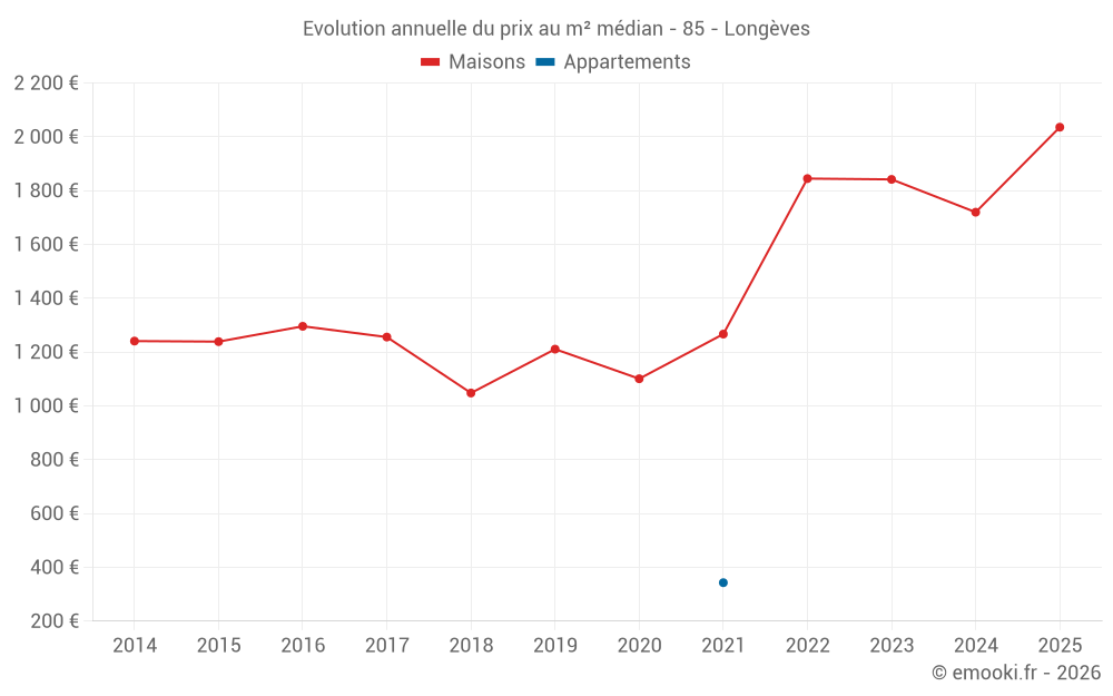 Le prix médian sur les 24 transactions de maisons des 24 derniers mois dans la commune de Longèves était de 1 750 € par mètre carré pour une valeur foncière médiane de 174 150 €. Sur cette période 60% des transactions se sont situées entre 1 485 et 2 154 € par mètre carré (du 2ème au 8ème déciles).