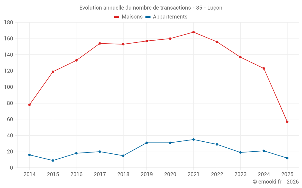 Le prix médian sur les 20 transactions d'appartements des 12 derniers mois dans la commune de Luçon était de 1 764 € par mètre carré pour une valeur foncière médiane de 88 200 €. Sur cette période 60% des transactions se sont situées entre 1 328 et 1 983 € par mètre carré (du 2ème au 8ème déciles).