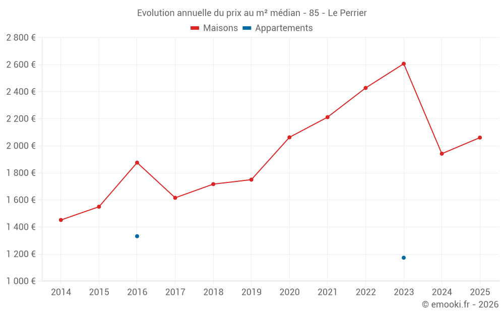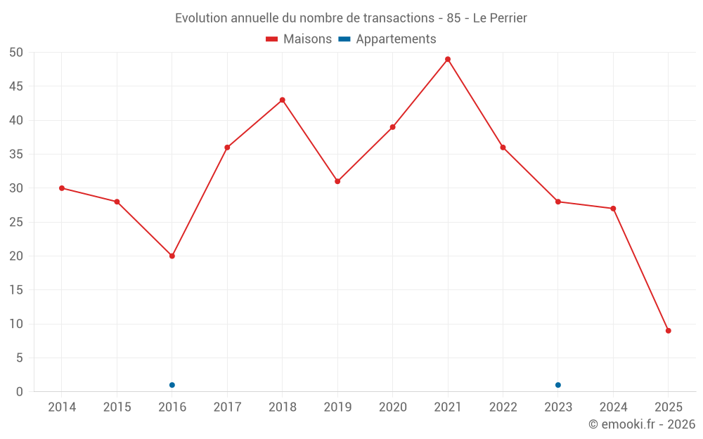 Le prix médian sur les 22 transactions de maisons des 12 derniers mois dans la commune du Perrier était de 2 023 € par mètre carré pour une valeur foncière médiane de 229 000 €. Sur cette période 60% des transactions se sont situées entre 1 682 et 2 729 € par mètre carré (du 2ème au 8ème déciles).