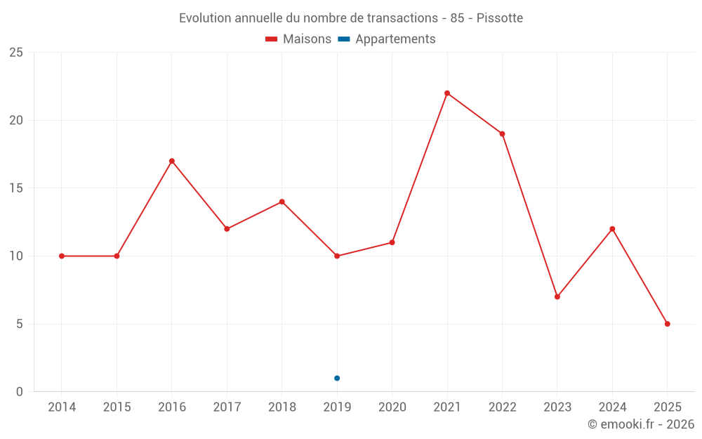 Le prix médian sur les 22 transactions de maisons des 24 derniers mois dans la commune de Pissotte était de 1 062 € par mètre carré pour une valeur foncière médiane de 133 250 €. Sur cette période 60% des transactions se sont situées entre 617 et 2 004 € par mètre carré (du 2ème au 8ème déciles).