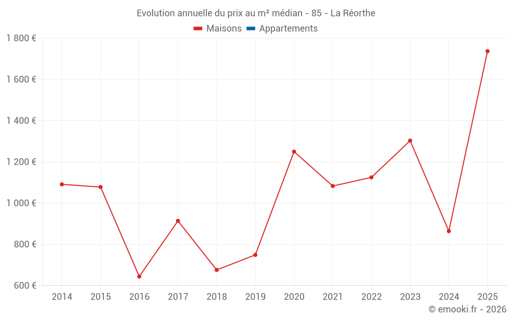 Le prix médian sur les 19 transactions de maisons des 24 derniers mois dans la commune de la Réorthe était de 1 060 € par mètre carré pour une valeur foncière médiane de 110 000 €. Sur cette période 60% des transactions se sont situées entre 765 et 1 868 € par mètre carré (du 2ème au 8ème déciles).
