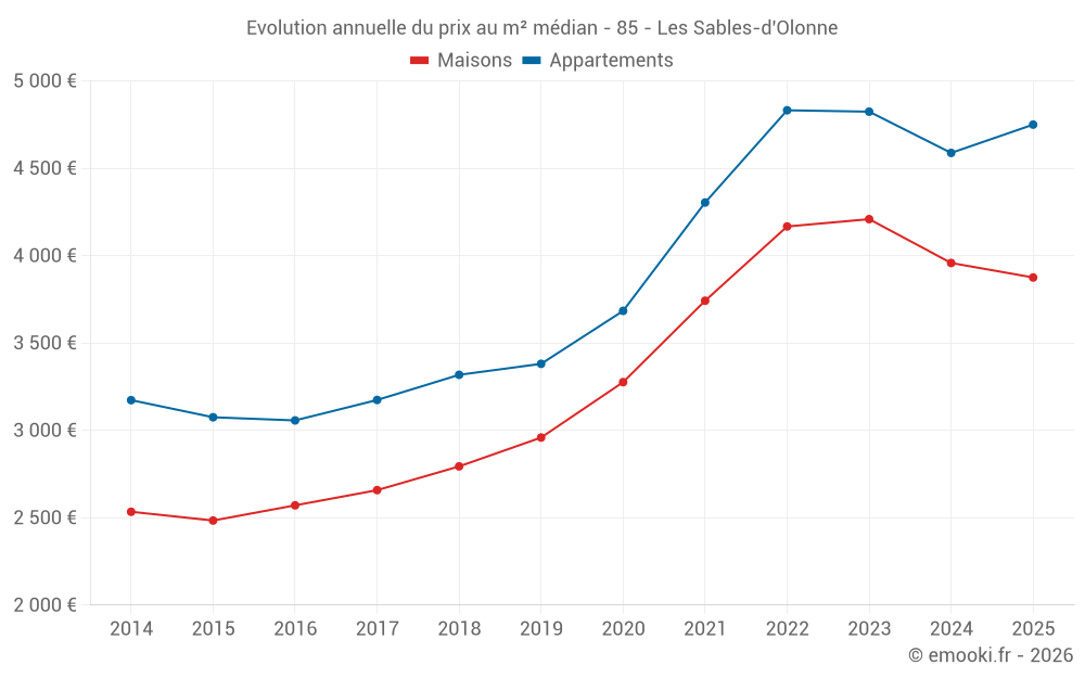 Le prix médian sur les 148 transactions de maisons des 3 derniers mois dans la commune des Sables-d'Olonne était de 3 721 € par mètre carré pour une valeur foncière médiane de 315 000 €. Sur cette période 60% des transactions se sont situées entre 2 931 et 4 658 € par mètre carré (du 2ème au 8ème déciles).