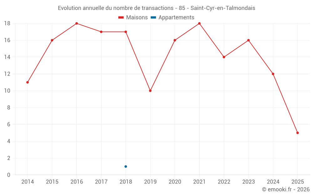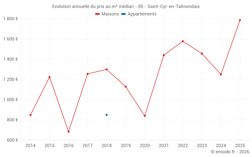 Le prix médian sur les 26 transactions de maisons des 24 derniers mois dans la commune de Saint-Cyr-en-Talmondais était de 1 797 € par mètre carré pour une valeur foncière médiane de 124 000 €. Sur cette période 60% des transactions se sont situées entre 944 et 2 478 € par mètre carré (du 2ème au 8ème déciles).