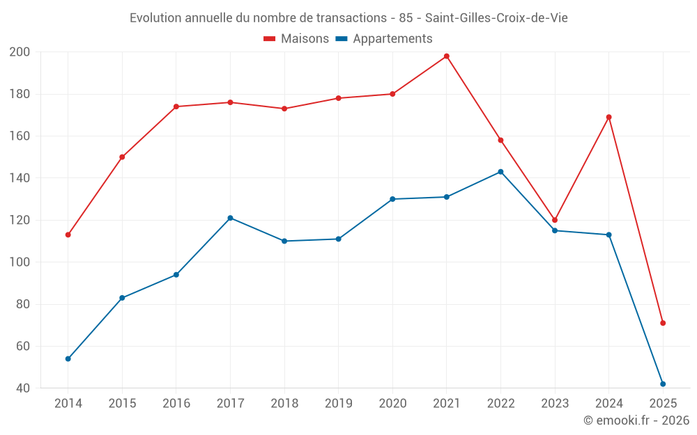 Le prix médian sur les 42 transactions d'appartements des 6 derniers mois dans la commune de Saint-Gilles-Croix-de-Vie était de 4 662 € par mètre carré pour une valeur foncière médiane de 201 432 €. Sur cette période 60% des transactions se sont situées entre 3 287 et 5 733 € par mètre carré (du 2ème au 8ème déciles).