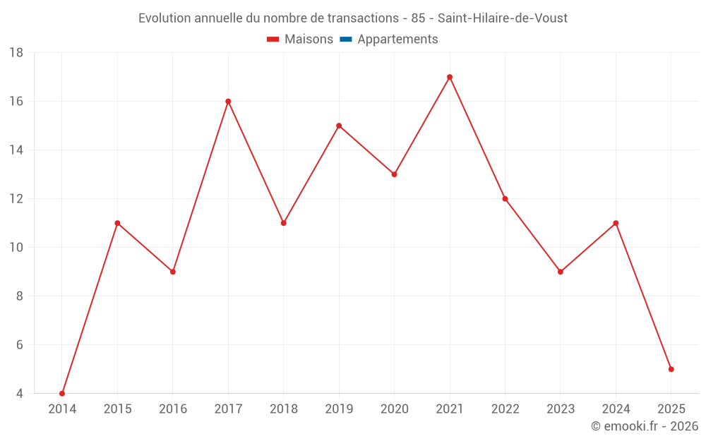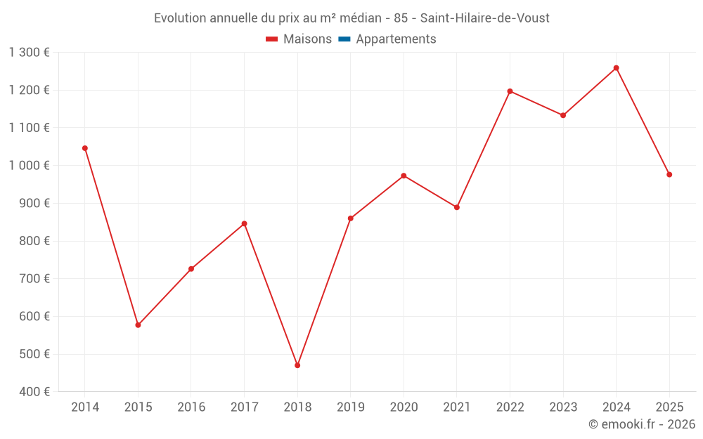 Le prix médian sur les 22 transactions de maisons des 24 derniers mois dans la commune de Saint-Hilaire-de-Voust était de 1 108 € par mètre carré pour une valeur foncière médiane de 151 216 €. Sur cette période 60% des transactions se sont situées entre 855 et 1 485 € par mètre carré (du 2ème au 8ème déciles).