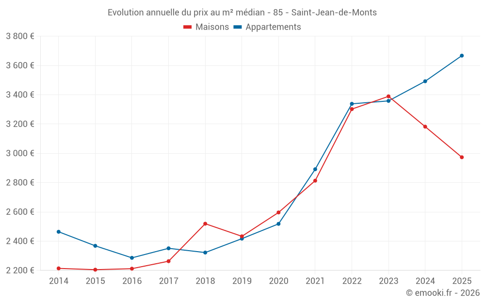 Le prix médian sur les 45 transactions de maisons des 3 derniers mois dans la commune de Saint-Jean-de-Monts était de 2 832 € par mètre carré pour une valeur foncière médiane de 235 000 €. Sur cette période 60% des transactions se sont situées entre 1 871 et 3 745 € par mètre carré (du 2ème au 8ème déciles).
