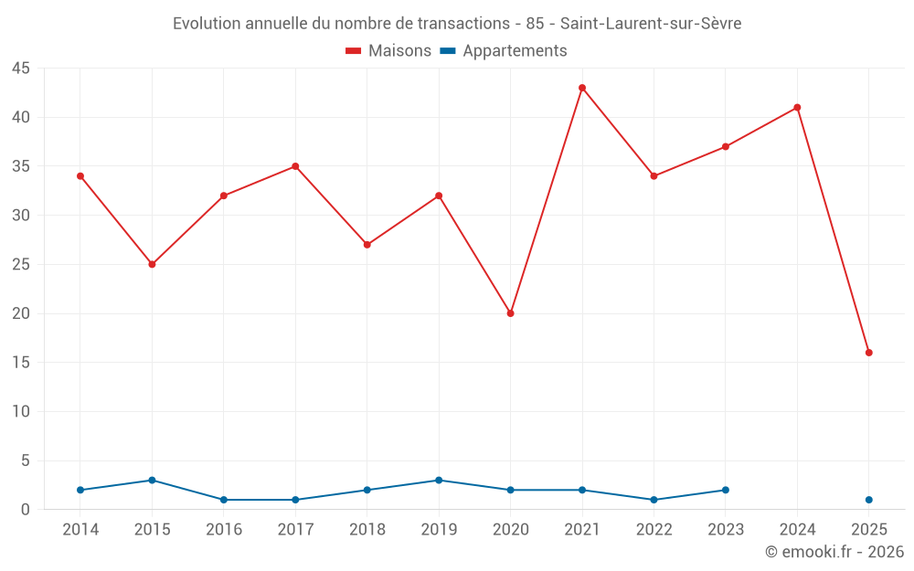 Le prix médian sur les 37 transactions de maisons des 12 derniers mois dans la commune de Saint-Laurent-sur-Sèvre était de 1 796 € par mètre carré pour une valeur foncière médiane de 157 000 €. Sur cette période 60% des transactions se sont situées entre 1 254 et 2 343 € par mètre carré (du 2ème au 8ème déciles).