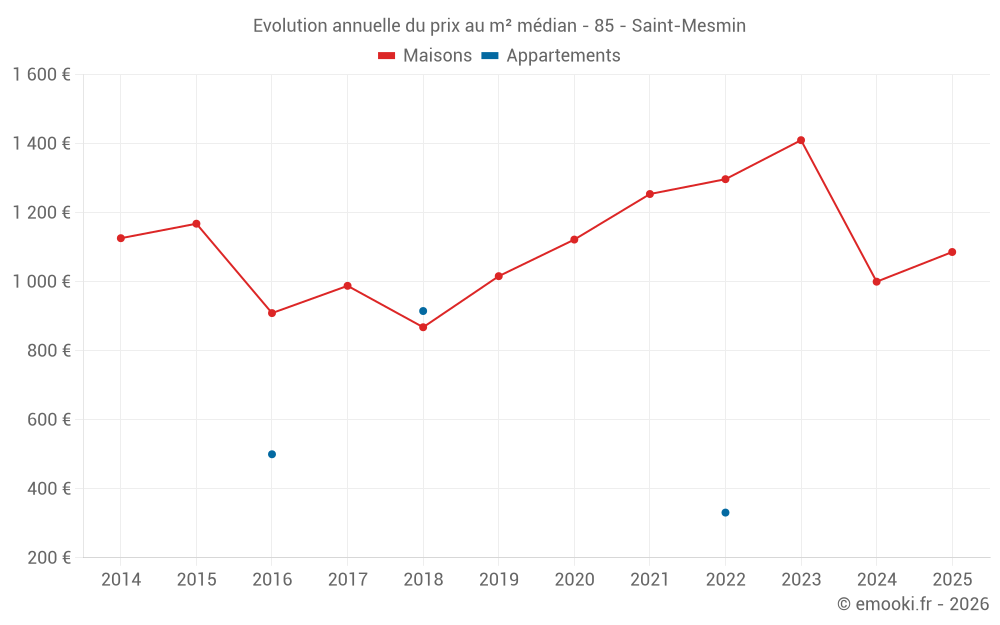 Le prix médian sur les 21 transactions de maisons des 12 derniers mois dans la commune de Saint-Mesmin était de 1 000 € par mètre carré pour une valeur foncière médiane de 116 000 €. Sur cette période 60% des transactions se sont situées entre 744 et 1 781 € par mètre carré (du 2ème au 8ème déciles).