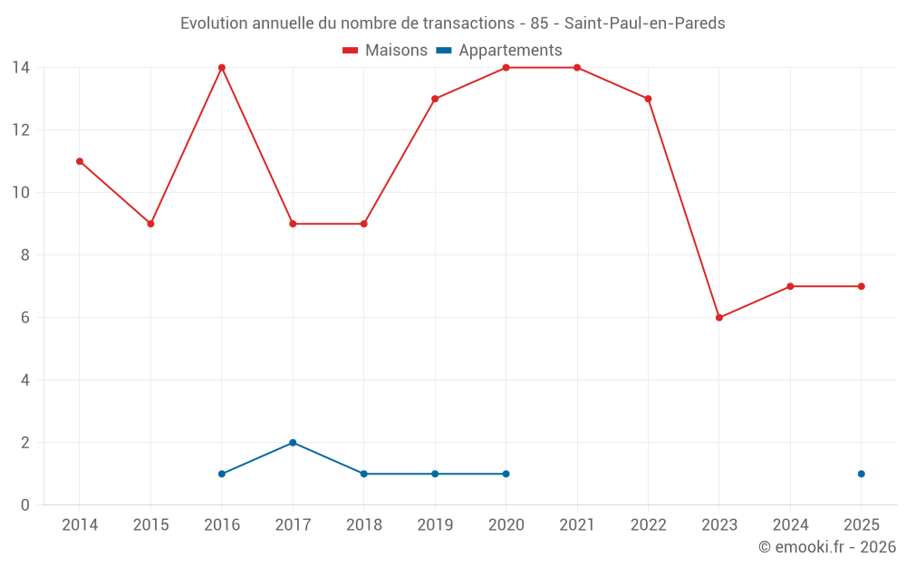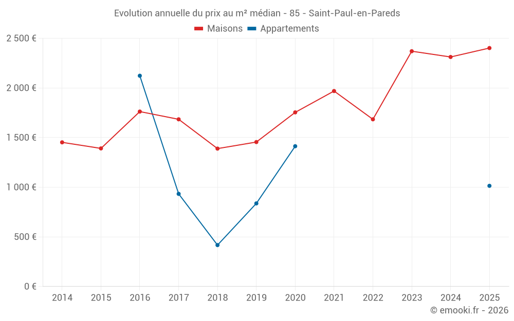 Le prix médian sur les 15 transactions de maisons des 24 derniers mois dans la commune de Saint-Paul-en-Pareds était de 2 354 € par mètre carré pour une valeur foncière médiane de 205 000 €. Sur cette période 60% des transactions se sont situées entre 1 378 et 2 796 € par mètre carré (du 2ème au 8ème déciles).