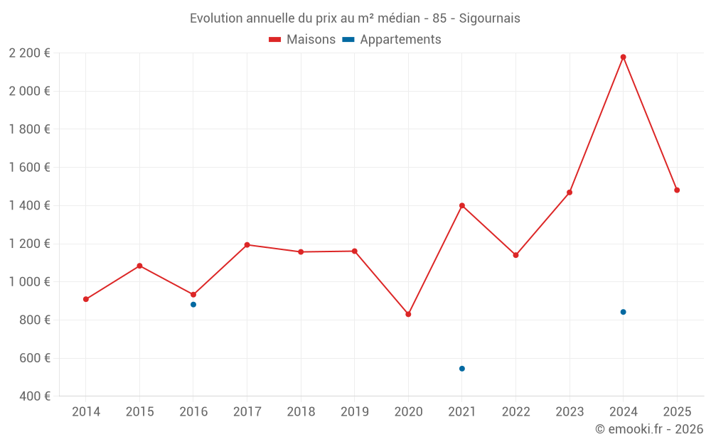 Le prix médian sur les 21 transactions de maisons des 24 derniers mois dans la commune de Sigournais était de 1 495 € par mètre carré pour une valeur foncière médiane de 149 000 €. Sur cette période 60% des transactions se sont situées entre 1 141 et 2 308 € par mètre carré (du 2ème au 8ème déciles).