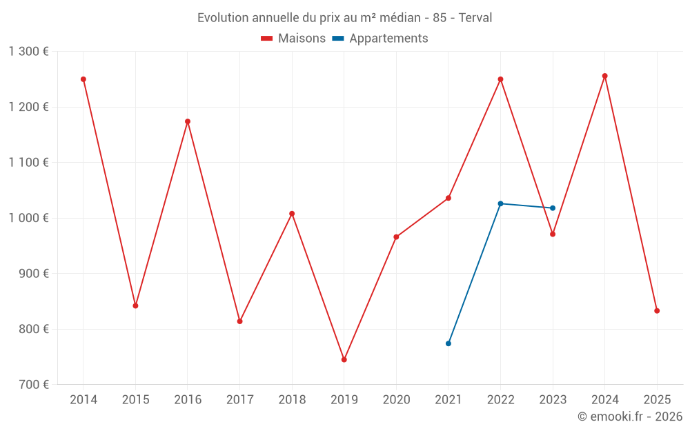 Le prix médian sur les 32 transactions de maisons des 12 derniers mois dans la commune de Terval était de 1 204 € par mètre carré pour une valeur foncière médiane de 131 500 €. Sur cette période 60% des transactions se sont situées entre 760 et 1 634 € par mètre carré (du 2ème au 8ème déciles).
