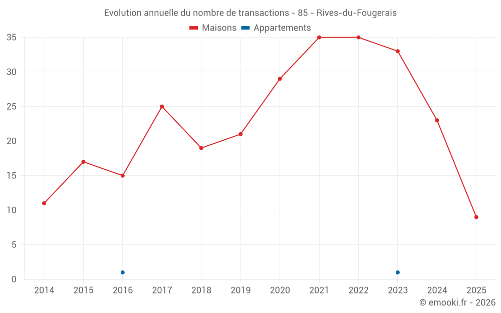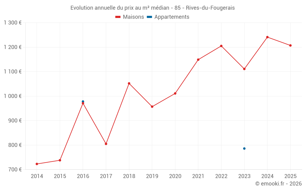 Le prix médian sur les 24 transactions de maisons des 12 derniers mois dans la commune de Rives-du-Fougerais était de 1 146 € par mètre carré pour une valeur foncière médiane de 148 000 €. Sur cette période 60% des transactions se sont situées entre 807 et 1 613 € par mètre carré (du 2ème au 8ème déciles).