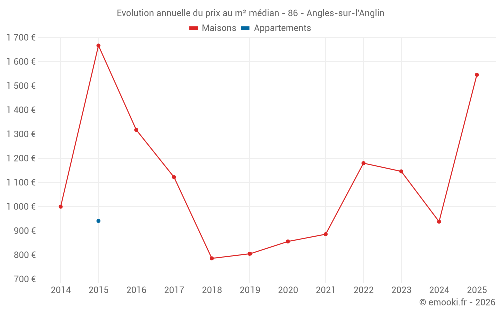 Le prix médian sur les 17 transactions de maisons des 24 derniers mois dans la commune d'Angles-sur-l'Anglin était de 972 € par mètre carré pour une valeur foncière médiane de 75 000 €. Sur cette période 60% des transactions se sont situées entre 815 et 1 419 € par mètre carré (du 2ème au 8ème déciles).