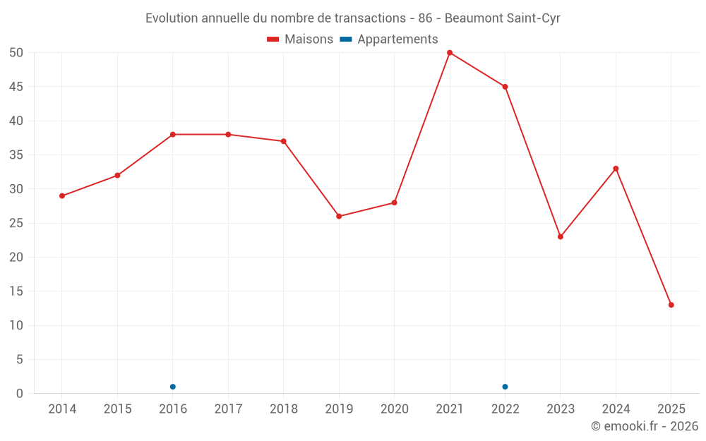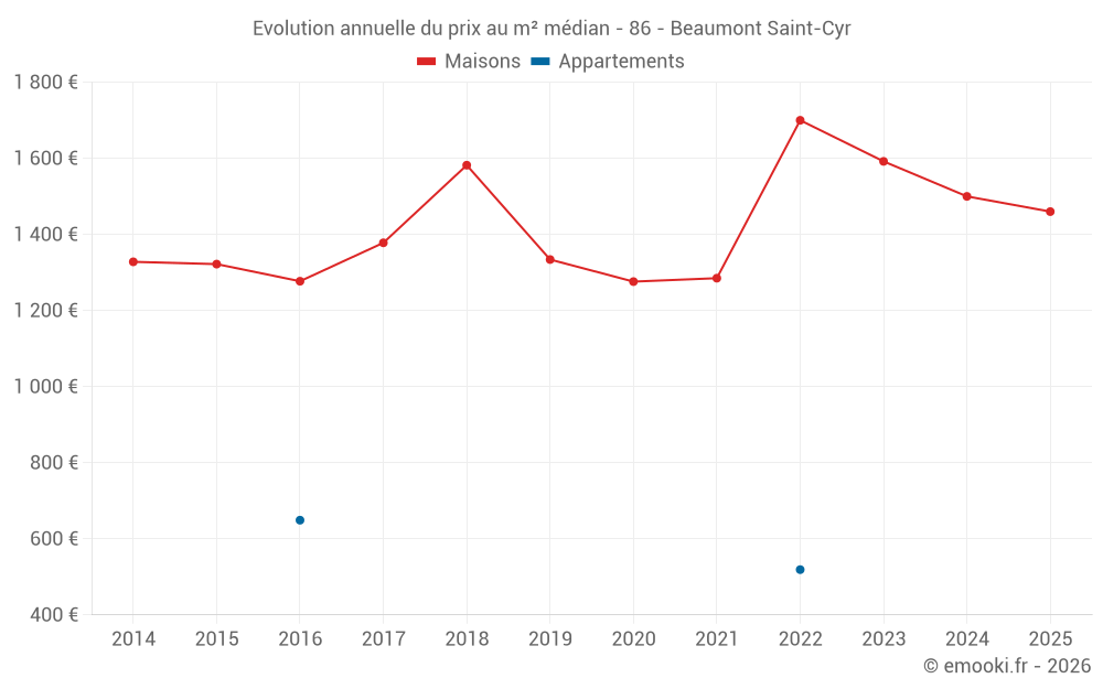 Le prix médian sur les 27 transactions de maisons des 12 derniers mois dans la commune de Beaumont Saint-Cyr était de 1 400 € par mètre carré pour une valeur foncière médiane de 145 000 €. Sur cette période 60% des transactions se sont situées entre 1 081 et 1 987 € par mètre carré (du 2ème au 8ème déciles).