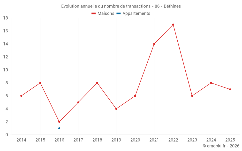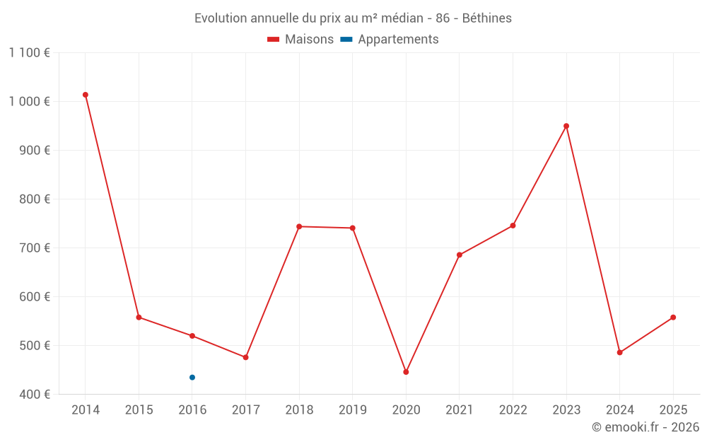 Le prix médian sur les 17 transactions de maisons des 24 derniers mois dans la commune de Béthines était de 558 € par mètre carré pour une valeur foncière médiane de 50 000 €. Sur cette période 60% des transactions se sont situées entre 418 et 868 € par mètre carré (du 2ème au 8ème déciles).