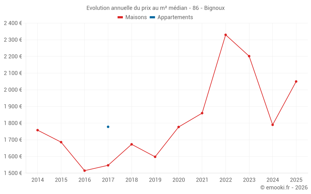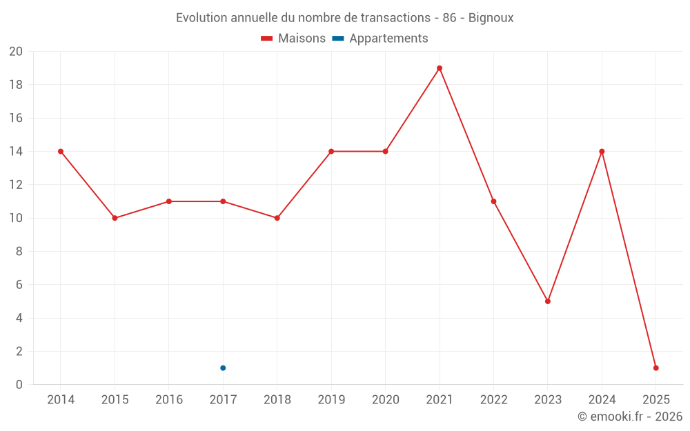 Le prix médian sur les 17 transactions de maisons des 24 derniers mois dans la commune de Bignoux était de 1 953 € par mètre carré pour une valeur foncière médiane de 220 000 €. Sur cette période 60% des transactions se sont situées entre 1 460 et 2 378 € par mètre carré (du 2ème au 8ème déciles).
